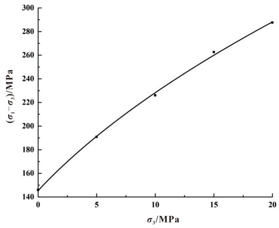 Using the Hoek–Brown strength criterion, it was found that the rock sample used in this test was a complete rock block; therefore, s = 1 was assigned. According to the uniaxial compression test, σc = 146 MPa, and by fitting the triaxial compression test data, m = 21.42, α = 0.499, the fitting formula is shown in Equation (4) and the fitting curve is shown in Figure 8. From the above analysis, the fitting effect of the Hoek–Brown criterion was demonstrated to be superior to that of the Mohr–Coulomb criterion, indicating that the rock sample had slight nonlinear characteristics.