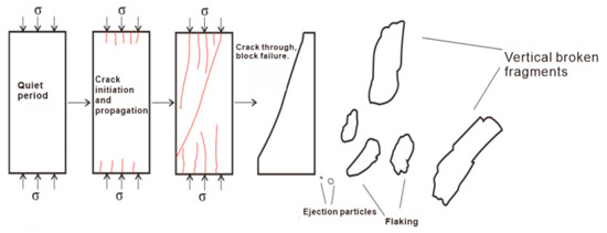 The failure diagram with confining pressure at 0 MPa, is shown in Figure 9. There was no phenomenon in the sample for a long time. With continuous application of the load, microcracks were gradually generated and then the clear and brittle sound of the rock sample cracking could be heard; however, the surface of the rock sample was not destroyed, but particle ejection occurred at the corner of the rock sample, producing flake spalling debris. With continuous loading, the microcracks continued to extend from both ends to the middle. Finally, the microcracks became interconnected; the rock sample lost its bearing capacity instantly and collapsed loudly.