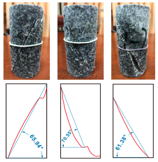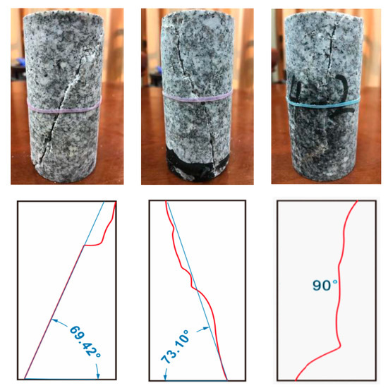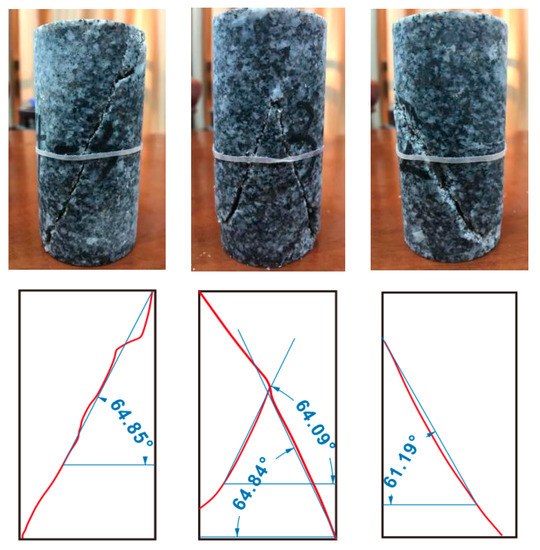 The failure diagrams for scenarios where the confining pressure was 10 MPa is shown in Figure 11. A further increase in the confining pressure made the rock sample denser, and the sample remained complete after failure. The inclined fracture surface was generated along the inclined plane at a certain angle, and the inclination angle of the fracture surface was mostly within the range of 61–71°.