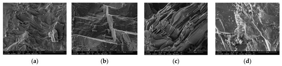 As shown in Figure 14, Figure 14a shows transgranular pull-out, mineral crystals are broken, and step-like patterns can be seen. Figure 14b,c shows step-like broaching and no powder accumulation on the steps, and the fracture surfaces are uneven. Sometimes, it can be seen that the broken mineral crystals are scattered on the steps and the above are the typical morphology of tensile failure. In addition, shear failure characteristics were observed on the fracture surfaces of flake spalling fragments. In Figure 14d, the stepped scratches were visible and the powder fragments were stacked on the steps. This indicates that the flake spalling debris is a tensile–shear comprehensive failure mechanism in which there is one main tensile failure and local existence of shear failure.