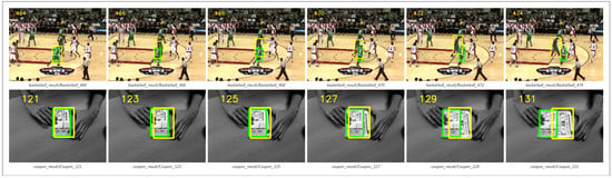 The DCF-based algorithms [,,] train correlation filters by extracting depth features and filtering subsequent frame images to obtain the most relevant object. DCF-based approaches treat the tracking problem as a binary classification problem. The trained classifier distinguishes the object and the background. It selects the candidate sample with the highest confidence as the prediction result. Classifiers typically trained using neural networks have a relative advantage in discriminating targets and interferences. e.g., the ATOM [] (Accurate Tracking by Overlap Maximization) network introduces IOU-Net (Intersection Over Union Network) [] based on the Siamese network to accurately estimate the target frame and improve the accuracy. The DiMP (Discriminative Model Prediction) [] algorithm also improves the discriminative ability and design template update. While introducing the online learning model, the iterative process of the loss function is optimized by the extremely fast gradient algorithm. The speed of online iteration is very high. The overall algorithm has reached SOTA in terms of robustness and speed performance with a significant improvement. However, the discriminative algorithm essentially regards the tracking as a binary classification problem, separating the object’s relationship and background. When the background of adjacent frames changes drastically, the discriminant algorithm cannot accurately track the object. Moreover, the discriminant algorithm relies on the appearance model’s construction. The discriminative algorithm relies on the construction of the appearance model, which requires the union of background and foreground information and the introduction of historical frame information.
