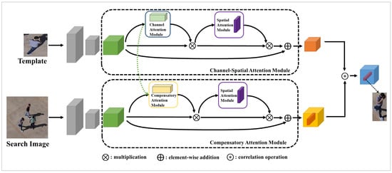 The architecture of our approach. On the template branch, the channel-spatial attention module is the same as the CBAM module. The pale green part is the channel attention matrix, and the purple is the spatial attention matrix. On the search branch, the pale yellow is our compensatory attention matrix, and the purple is likewise spatial attention matrix.