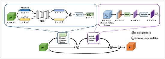 where ⊕ denotes the element-wise addition and means the multi-layer perception. The multi-layer perception is composed of a channel reduction layer, which its , and a ReLU activation, and a channel increasing layer, which its and a sigmoid activation.