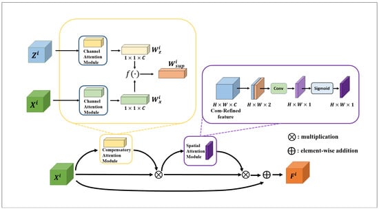 Finally, and are weighted on the , and feature maps to obtain a new feature map with reassigned channel weights in the layer i. The specific steps of the compensated attention strategy applied to the search branch are the following Algorithm 1.