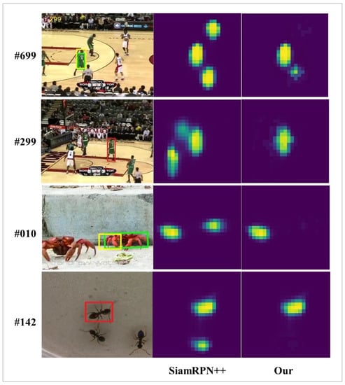 Current algorithms usually solve this problem from two aspects: one type of algorithm expands positive samples by using translation, flipping, and other means, and at the same time increases various types of complex negative samples so that the network can discriminate. For example, in the training phase of DaSiamRPN [], the ImageNet [] and COCO detection datasets [] are made into positive sample pairs through data amplification to expand the types of training data sets and improve the generalization ability of the tracker. Moreover, it extracts pictures in different categories, and the same category as negative samples generates various kinds of complex negative samples and improves the discriminative ability of the tracker. The other is to improve the feature expression ability of the feature extraction module. For example, SiamRPN++ [] introduces deeper Resnet [] as the backbone network. The extracted features have a more vital expressive ability, which improves the anti-interference ability of the tracker. However, SiamRPN++ is still susceptible to interference from similar objects in a complex background. The Siamese network is essentially a template matching process that takes the first frame of target information as a template and cannot judge interferers in the background similar to the object. Moreover, they use the same classification network for feature extraction. It is impossible to obtain features with different directivity between the template and the search area. As shown in Figure 1, when other objects similar to the target appear in the current frame, the features extracted by the feature extraction network are very similar. As a result, double peaks appear in the response map, it is impossible to resolve the correct target. The Siamese-based algorithms do not have an online update mechanism, so the drifts are generated, and the tracking fails.