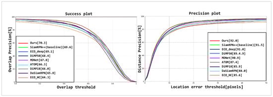 Our proposed tracking algorithm is evaluated on the generic tracking datasets VOT2018 [], OTB2015 [], and LaSOT []. At the same time, ablation experiments are performed on different components. Some of the state-of-the-art tracking algorithms, such as the Siamese family of algorithms, DiMP, ATOM, and the algorithms in this paper, are selected for comparison. Then, the effectiveness of different domain attention is evaluated at different layers of the network and in different combinations. Our method is trained with stochastic gradient descent (SGD). The experimental environment is 128G of running memory and 4 GTX 1080ti. We use synchronized SGD over 4 GPUs with 128 pairs per minibatch (32 pairs per GPU), which takes 12 h to converge. We use a warmup learning rate of 0.001 for the first 5 epochs to train the RPN braches. The Siamese network framework used is the PySOT [] framework based on PyTorch 0.4.1 []. For the last 10 epochs, the whole network is end-to-end trained with a learning rate exponentially decayed from 0.005 to 0.0005. The parameters of the whole network are released for training later. One iteration processes 64 images with a CPU work thread of 1. The whole training is supported by the YouTubeBB [], GOT10k [], VOT2018, and DET [] datasets.