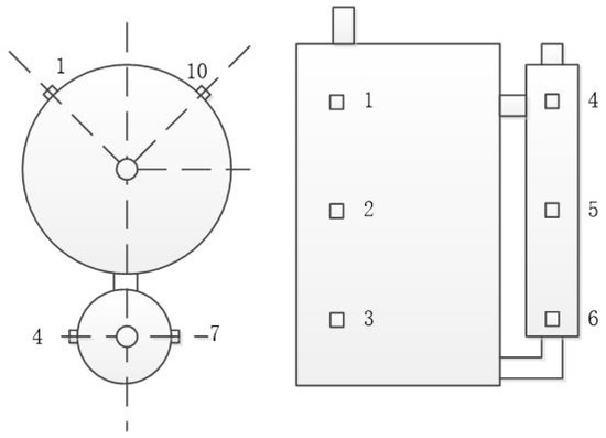 Realize the conversion of sound pressure level, where P0 = 2 × 10−5 pa is the reference sound pressure. The location of the measuring points and the near-field sound pressure level of each measuring point are shown in Figure 1 and Figure 2, respectively.