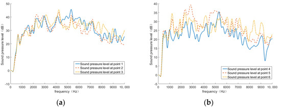 Sound pressure level frequency response of each measuring point: (a) measuring point of the main shell; (b) measuring point of the reservoir.