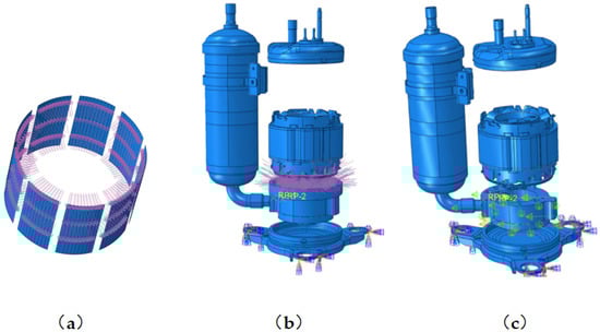 According to the action relationship of each force on the compressor, the relevant finite element model is established in ABAQUS, and the force at each position is measured by the real machine. According to the measured electromagnetic force data, the magnitude of electromagnetic force is not equal on different pins, and its magnitude is also different at different positions of the same pin. Therefore, each pin is divided into several parts, and each part has a corresponding electromagnetic force data. After converting its time domain data into the frequency domain, it is directly loaded at the corresponding position, as showed in Figure 3a. The figure only shows the loading of the pin and force. For the pulsating pressure, its active position has not changed, so its loading method is also relatively simple. Refer to the extraction of pulsating pressure and apply pulsating pressure at the corresponding position, as showed in Figure 3b. However, the cylinder pressure always changes with the rotation of the crankshaft, which increases the difficulty of loading. Here, firstly, COMSOL software is used to analyze the cylinder separately; the stress amplitude and direction of the whole cylinder at different time are calculated, and then the data is input into ABAQUS to load the cylinder volume force. The loading condition is shown in Figure 3c.