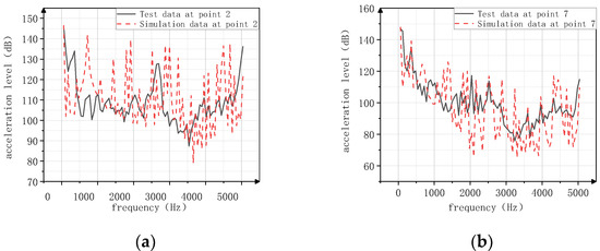 According to the action relationship of the main force, the finite element model of the compressor is loaded, and the acceleration of the compressor shell is simulated and calculated. The arrangement of measuring points is shown in Figure 1. Measuring points 1, 4, 7, and 10 are 50 mm away from the upper surface. Measuring points 3, 6, 9, and 12 are 50 mm away from the lower surface, and measuring points 2, 5, 8, and 11 are 140 mm away from the lower surface. Extract data and draw graphics. It is found that for measuring points 1–6, the acceleration comparison between simulation and test is similar to that of measuring point 2. For test points 7–12, the comparison between simulation and test data is similar to that of test point 7. Therefore, it is only necessary to draw the relationship curve between acceleration level and frequency at measuring point 2 and measuring point 7 to reflect the noise distribution of the compressor. The comparison between simulation and test data is shown in Figure 4.