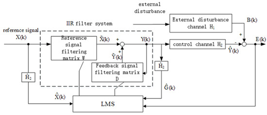 - After the reference signal X(k) with a high degree of correlation with the external disturbance signal is adaptively filtered by the IIR filtering system, an n-dimensional control vector is generated, corresponding to the signal input of n actuators respectively, and then the control signal is generated through the control channel Ŷ(k);