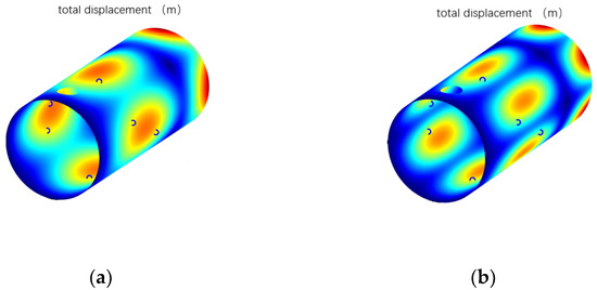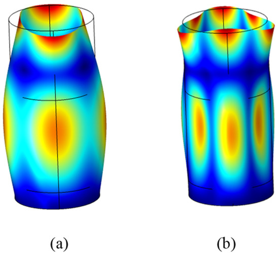 It can be seen from the table that the energy is mainly concentrated at 3672 Hz and 3469 Hz. These two frequencies correspond to the ninth and seventh modes of the compressor shell, respectively. Therefore, it is mainly necessary to control these two modes during noise reduction. According to the COMSOL simulation results, the modal vibration modes are shown in Figure 6.