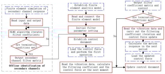 In the simulation of the active control effect, using programming software carries out data exchange and iterative calculation of control force amplitude and filter coefficient. Using software for finite element analysis, the control force amplitude is updated each time, finite element analysis of the mechanical field is carried out, and the vibration response of the corresponding measuring points is obtained each time. With the iteration, the data are continuously exchanged between the two to realize the simulation of the active control algorithm.