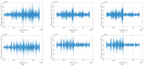 Variation of vibration velocity at some sensor positions: (a) no control of measuring point 1; (b) FUNLMS control of measuring point 1; (c) Nadam-FUNLMS control of measuring point 1; (d) no control of measuring point 3; (e) FUNLMS control of measuring point 3; (f) Nadam-FUNLMS control of measuring point 3.