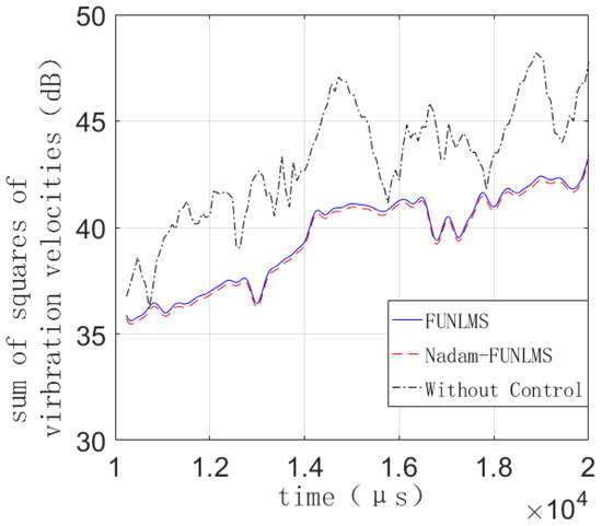 After the surface vibration velocity of the main shell is squared, the surface integral is taken. This value is positively correlated with the total kinetic energy of the structure, which can be used to evaluate the overall control of the structure by various algorithms. After 10,000 μs of control is added, the system response to steady state is evaluated, and the curve is smoothed. Results of the Nadam-FUNLMS, FUNLMS, and no control system are shown in Figure 9.