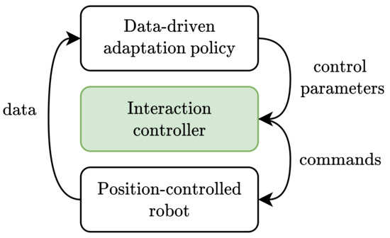 While we focus on the design of robot-agnostic interaction controllers, the provision of control parameters is beyond the scope of this work. Indeed, it is a common challenge in interaction control, which is usually addressed by manual tuning, when some information about the interaction dynamics is available, or, most commonly, by an automatic, usually data-driven, learning/adaptation procedure, when the interaction dynamics are unpredictable or prone to change [27,28,29,30,31]. The relationship between interaction controllers, lower-level motion control, and higher-level adaptation policies is depicted in Figure 1.