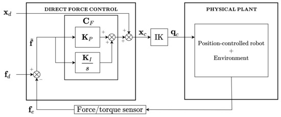When an accurate control of the generated contact force is required, it is necessary to devise control schemes that allow the desired interaction force to be specified directly for one or more directions in the workspace. Hence, a direct force control scheme can be designed with the closure of an outer force regulation feedback loop generating the control input for the position-controlled robot, as shown in Figure 3.