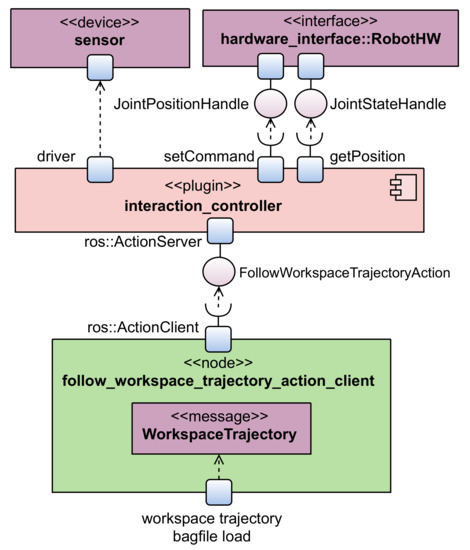 Interaction controllers are ROS nodes that internally implement a communication mechanism of type ros::ActionServer. The actionlib-based communication was chosen to exploit the potential of action services so that the current state of the robot during trajectory execution can be monitored by a ros::ActionClient. A custom action message FollowWorkspaceTrajectory allows for the specification of the desired workspace trajectory together with the desired force references. The goal of this action message is the custom WorkspaceTrajectory message provided in [36] and extended to include wrench references. The feedback of the FollowWorkspaceTrajectory message will contain, for each waypoint reached by the manipulator, the desired and actual pose and wrench, and the difference between them, the error. This information is received by the ros::ActionClient, which stores it in ROS bagfiles [37] for further analyses.