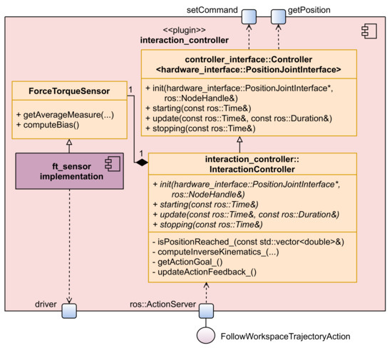 The communication between the controller and the force/torque sensor is handled through the class ForceTorqueSensor, designed as a plugin, such that specific implementations can be provided for specific sensors, both real and simulated. In particular, an object of the ForceTorqueSensor class is instantiated in the init function and is used at each update call to obtain the force measures from a driver. It is worth noting that ROS already provides a force_torque_sensor_controller [40] based on topic communication but, since the API is faster, it is preferable for real-time systems. Thus, new force/torque sensors can be added by implementing the ForceTorqueSensor interface.