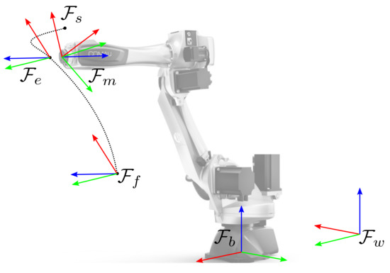 The reference frames used by the interaction controllers are reported in Figure 7. is the base reference frame, usually used to specify the workspace trajectory. is the world reference frame, and, when different from , might be used to interpret the pose subject to inverse kinematics. is transformed into through the constant transformation matrix . is the flange frame (usually the last frame in a kinematic chain without end-effector), and is where the force/torque sensor is mounted. is the sensor frame, with respect to which force/torque measures are given. The constant transformation matrix depends on the mechanical interface between the flange and the sensor. is the end-effector frame when the robot is at the trajectory’s starting point, while is the end-effector-fixed moving frame.