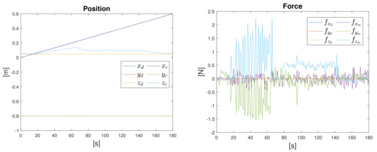 As it is clear from Figure 8, as soon as the robot is in contact with the ramp (around 20 s), it slides over it, causing a non-negligible position error and higher contact forces along z. Since the trajectory is longer than the ramp, when the interaction ends (around 140 s), the robot recovers the desired position and force, with zero error.