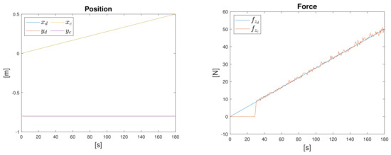 From this equation, it can be observed that only by perfectly knowing the environment it is possible to have a zero force error, by carefully selecting and . Otherwise, when the environment is unknown, the force reference is not reached and the error is subject to the imposed compliance. If one wants to control the contact force, variable impedance schemes can be used [27,28,29,30,31].