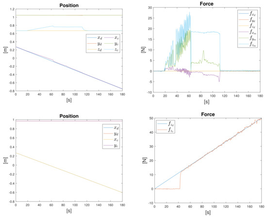 The same experiments are performed with the Smart-Six by only changing configuration parameters, i.e., reference frames, impedance matrices, and PI gains in configuration files. Similar observations made for the UR10 hold, as can be seen from Figure 10, demonstrating the flexibility of the proposed architecture. It is worth noting that the controllers’ performance can be improved through better knowledge of the interaction dynamics and an informed tuning of the controllers’ parameters, but this is addressed elsewhere in the literature [31,48,49], and goes beyond the scope of this communication.