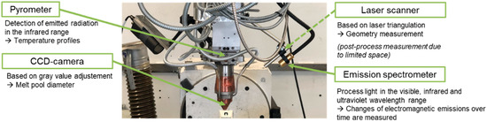 Measurement data were generated by a pyrometer, a CCD camera, an emission spectrometer and a laser scanner. The measurement setup is shown in Figure 1.