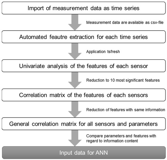 Data preparation in the field of AI is carried out to create a data set suitable to train artificial neural networks, for instance. In this work, in addition to the process parameters, measurement data were made available as inputs. The Python package “tsfresh” was applied to automatically extract several hundreds of features from the measurement data. They had to be analyzed, and the number of features had to be considerably reduced to make sure that only relevant information was given into the network. Figure 2 represents the procedure applied in the context of this work.