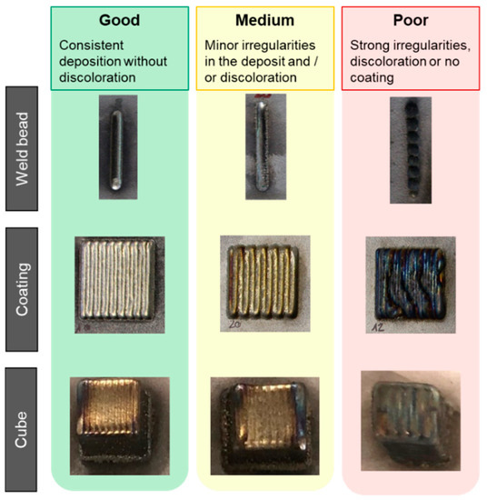 Fifty samples of each geometry (weld beads, coatings and cubes) were produced. It was ensured that a large random variation would provide a good data base for the artificial neural networks. For this reason, approximately the same ratio was generated from each category (good, medium, poor). Figure 3 exemplifies one sample from each geometry and category.