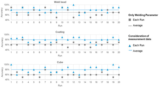 Based on the previous results, one ANN based only on process parameters and one ANN based on the selected features were created, trained and validated for each of the different geometries. A total of 20 training and test runs were executed for each ANN. The accuracies of the individual runs can be taken from Figure 4.