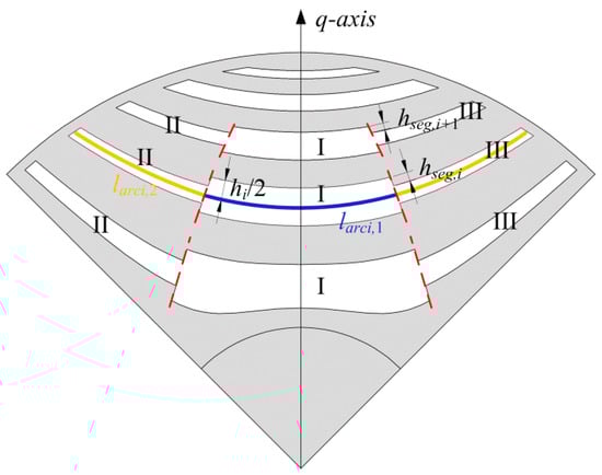 The proposed cross-shaped flux-barriers are divided into three parts to calculate the magnetoresistance according to the structural characteristics of the rotor. Since the proposed cross-shaped flux-barriers are symmetric for the q-axis, the reluctance between the two ends of the separated barrier is equal. is the reluctance of the ith layer of the proposed cross-shaped flux-barriers in region I and is the reluctance of the ith layer of the proposed cross-shaped flux-barriers in region II and region III. The reluctances and are defined as, respectively,