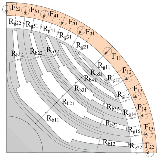 The MEC for the proposed motor is shown in Figure 3. The source of the magnetomotive force and the air-gap reluctance is the same for both models because the stator is the same. The difference between them lies only in the equivalent reluctance of flux-barriers caused by different shapes in the rotor.
