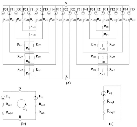 (a) MEC for the proposed motor; (b) Simplified equivalent circuits of (a); (c) Final simplified equivalent circuits of SynRM with proposed rotor structure MEC for a SynRM with cross-shaped flux-barriers.