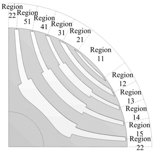 The MMF drops of the flux-barriers are independent of the path of the magnetic field line through the barriers [21]. Therefore, the air-gap flux density at different locations can be calculated according to the following method proposed in this paper, and the partition diagram of air-gap between stator and rotor are shown in Figure 5.