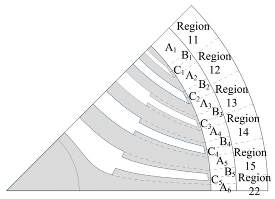 To further study the influence of cross-shaped flux-barriers on the distribution of air-gap flux density, the air-gap between stator and rotor in one-eighth motor model was divided more accurately from the original six regions to obtain 16 regions, as shown in Figure 6, which were mainly divided according to the width of the flux-barriers end. These 16 regions can be divided into three parts for research: one is the region A1–A6 corresponding to the segments, and the other is the region B1–B5 and C1–C5 corresponding to the end of the flux-barriers.