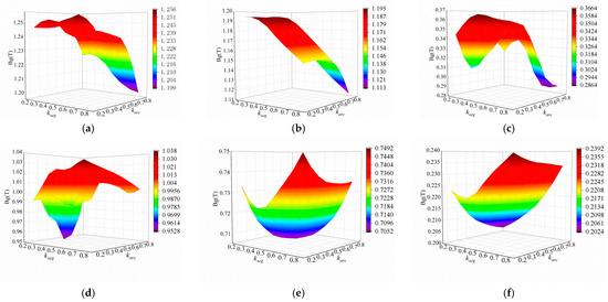 Figure 7 shows the influence of parameters of cross-shaped flux-barriers on the air-gap flux density of region A1–A6 which are mainly located in the corresponding air gap at the end of the segment of the rotor. It can be seen that when the parameter remains unchanged, the value of flux density of region A1, A2 and A3 all remain unchanged first and then decrease with the increase of . When is constant, the value of flux density decreases with the increase of for regions A1 and A2, while the value of flux density increases first and then decreases with the increase of for region A3. Furthermore, the value of flux density decreases to the minimum when for all three regions. The variation trend of A5 and A6 are basically the same as each other when one parameter of and remains unchanged. The value of flux density decreases first and then increases with the change of the other parameter. The change of flux density value in region A4 is different from the above regions while the cross-shaped flux-barrier parameters change, which is approximately funnel-shaped, and the value of flux density is the minimum when . The main reason is that the change of value and changes the equivalent reluctance of the flux-barriers in MEC, which leads to the corresponding change of the value of flux-density of the air-gap at different positions.