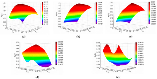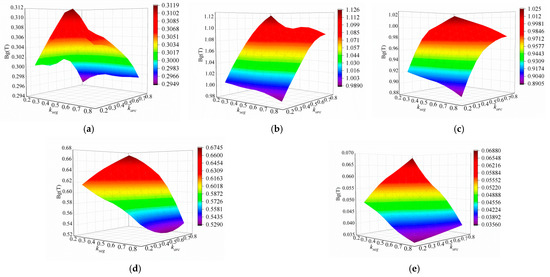 Figure 8 shows the influence of parameters of cross-shaped flux-barriers on the air-gap flux density of region B1–B5 which are mainly located in the air gap corresponding to the upper half of the end of the flux barriers. It can be seen from Figure 8b,c that the cross-shaped flux-barrier parameters have the same influence on regions B2 and B3. That is, when is fixed, the value of flux density increases with the increase of , while the value of flux density has little change with when is fixed. When one parameter is fixed, the value of flux density increases first and then decreases with the increase of the other parameter. and have slightly different effects on region B4 because it can be seen that when is constant, the value of flux density decreases with the increase of . In contrast, the value of flux density increases with the increase of when is small and remains unchanged when is large. It can be seen from the observation of Figure 8e that cross-shaped flux-barrier parameters exert a similar influence on the value of flux density on region B5 to region A5.