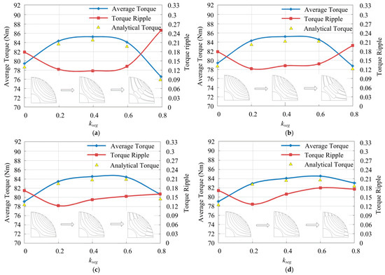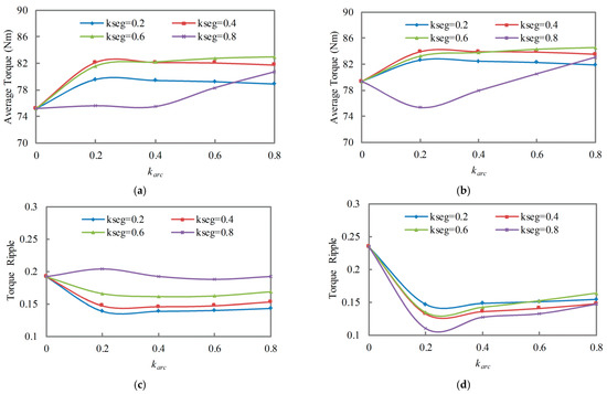 The effect of and on average torque and torque ripple: (a) ; (b) ; (c) ; (d) .