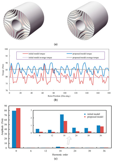 The 3D view of the rotor of initial motor (left) and proposed motor (right) are showed in Figure 12a. Figure 12b shows the comparison of torque waveform between the initial motor and the proposed motor with the cross-shaped flux-barriers rotor. The torque ripple decreases by 34.06%, and the average torque increases by 11.34% with the comparison of the initial motor. Figure 12c highlights that the shaped of flux-barriers affects the intent of torque harmonic the proposed rotor structure with cross-shaped flux-barriers with low torque ripple has lower torque harmonics.