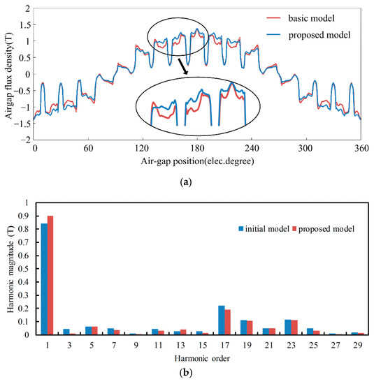 Figure 13 shows the contrast diagram of air-gap flux density distribution and harmonic content of no-load motor at rated current. Figure 13a reflects the existence of stator slot and rotor anisotropy, and it can be seen from Figure 13b that there are odd harmonics in addition to the fundamental components. The third and its multiple harmonics are primarily caused by magnetic saturation, and the 17th and 19th harmonics are primarily related to stator slotting, and the 11th, 13th, 23rd, 25th and 29th harmonics are mainly caused by rotor structure. As for the two motors in this paper, the harmonic components vary with the shape of the flux barrier in the rotor. It can be seen from the Figure that the amplitude of the fundamental wave of the air-gap flux density of the proposed SynRM with cross-shaped flux-barriers rotor structure is higher than that of the initial SynRM, and the majority contents of harmonics are reduced, which makes the air-gap flux density distribution more sinusoidal and leads to reduced torque ripple.