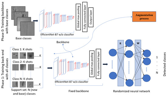 Basically, this can be considered as a multi-phase incremental learning mechanism. In phase 0, we fine-tune a large network (based on EfficientNet-B7) with lots of samples of the base classes. This backbone network is constructed by leaving the classification block of EfficientNet-B7, adding a global max-pooling layer, and two fully connected layers. The first has 1024 neurons, the second is the fully connected output layer with the number of classes to be trained. After training it with the available samples, this network, without the output layer, is frozen and used in the next phase as the backbone. Phase 1 is an incremental step, where we fine-tune only the back-end randomized network given the 1024 feature vectors as input. Naturally, phase 1 can be repeated many times, as new shots (or classes) appear.