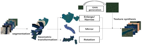 Figure 1 shows a general overview of the technical roadmap of our method. First, we extracted the geometric polygons of the elements in the original scene image via image segmentation, and subsequently, performed geometric transformations on the obtained polygons through computer graphics. Finally, we used texture synthesis technology to synthesize the texture of the corresponding ground object, and subsequently, merged it into a new RSSI.