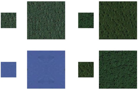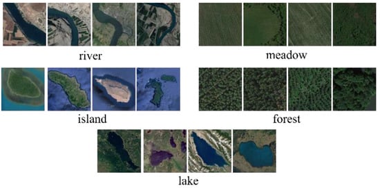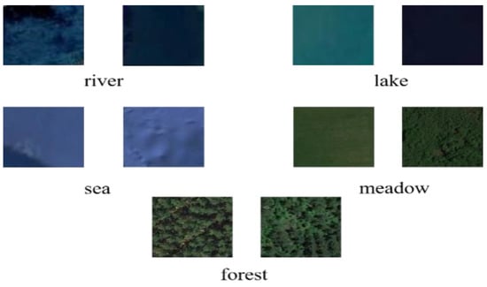 Based on the work of Zhou et al. and Efros et al. on texture synthesis, we used a GAN to synthesize the texture of each element extracted. The texture synthesis technology in this section is based on the work of Efros and Zhou. We sampled the surface texture of rivers, forests, grasslands, and oceans in RSSIs and selected a big number of typical surface texture samples as the input of texture synthesis. When performing texture synthesis, we selected a total of 100 texture samples from five categories, including rivers, lakes, seas, meadows, and forests, representing the typical characteristics of the corresponding category. These five classes of samples were taken from rivers, lakes, ocean forests, and grasslands. Figure 2 is an example of our selection of samples.
