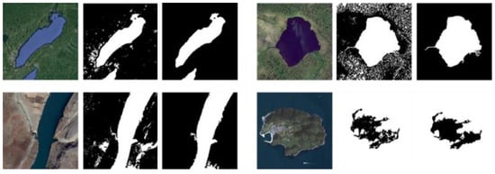 Four examples are shown in Figure 4 of the results of segmentation on a lake, river, and island. In each example, the original image is shown on the left, and in the middle, the k-means segmentation results are shown, and the final processed segmented result is on the right.