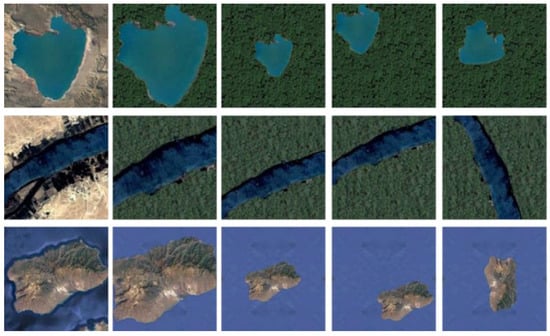After the geometric boundary of the elements was obtained, we carried out a geometric transformation on the geometric boundary of the elements. In Figure 5, the leftmost side of each line is the original scene image, and then the geometric transformation of zooming in, shrinking, translation, and rotation is shown successively from left to right.