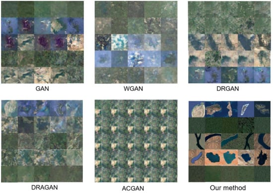 At present, existing methods of data generation have been mainly developed based on generative adversarial networks (GANs). Problems such as distortion and long training times have been reported in the generation of remote sensing scene data using traditional GAN networks and associated variants. Karras et al. [1] proposed a gradually developed generator and discriminator GAN to generate natural images such as human faces and animals. However, the size of the generated images was limited. Subsequently, it was found that this method could not be applied to RSSIs. Zhao et al. [2] used pre-trained GAN models to generate natural images under conditions of extremely limited data. This is consistent with the lack of scene data addressed in the present work. However, after experiments, it was found that problems such as distortion persisted. Han et al. [3] proposed a high-resolution remote sensing scene data generation method based on a Wasserstein GAN network, which solved the problem of distortion to a certain extent. However, the size of the generated data was limited. Pan et al. [4] proposed a diversified improved GAN with the ability to generate RSSIs. However, due to limitations in computing power and training time, this method nonetheless was unable to learn to generate scene images of sufficient size.