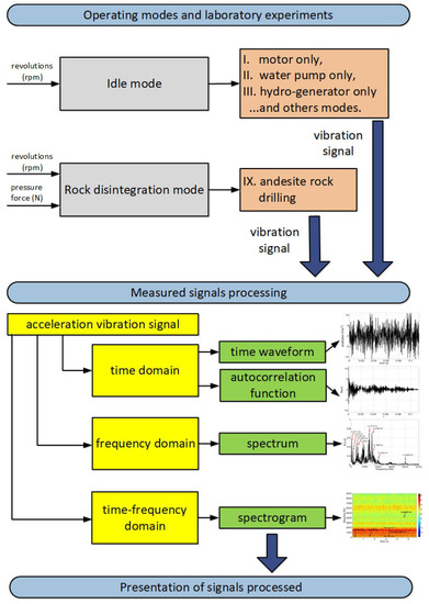 The conceptual scheme of experimental methodology and processing of the vibroacoustic signal is shown in Figure 1.