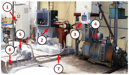 Main parts of the drilling stand (1—Power switchboard, 2—experimentally drilling machine, 3—measuring system ADASH, 4—hydroelectric generator, 5—water pump, 6—sludge pit, 7—hose for outfall of drilling fluid).
