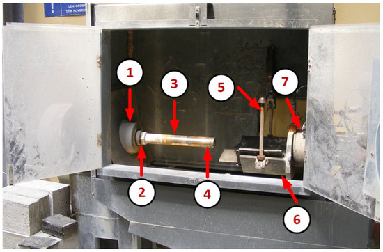 Detailed view to the drilling rig (1—headstock, 2—spindle drill, 3—core barrel, 4—drilling bit, 5—clamping mechanism, 6—centering sled clamping mechanism, 7—head of the tensimeter sensor).